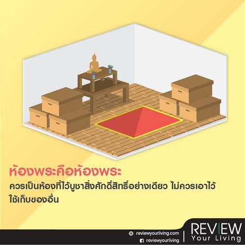ห้องพระคือห้องพระ ห้องพระก็คือห้องสำหรับตั้งบูชาพระหรือสิ่งศักดิ์สิทธิ์เพียงอย่างเดียว เราอย่าใช้ห้องพระไว้เก็บข้าวของชนิดอื่นๆ รวมทั้งห้องพระไม่ควรอยู่ติดกับห้องน้ำหรือมีประตูตรงกับห้องน้ำ