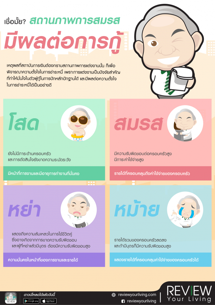 ผู้กู้จะถูกพิจารณาจากสถานภาพสมรสในแต่ละสถานะแตกต่างกันไป โดยถ้ามีข้อด้อยในจุดใดก็ตาม ให้แสดงข้อเด่นของผู้กู้ที่จะออกมาสร้างความมั่นใจทดแทนกันได้