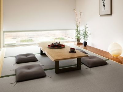 พื้นที่ที่นำเบาะกับโต๊ะเล็กมาจัดวางไว้ โดยไม่จำเป็นต้องปูเสื่อแต่สามารถเลือกใช้พรมสีอ่อนๆ ที่เข้ากับห้องนั้นๆ ได้