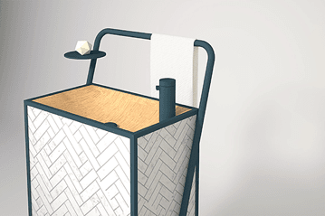 ห้องน้ำเป็นสถานที่ที่เราใช้งานเป็นกิจวัตร ซึ่งเปรียบเหมือนพิธีกรรมที่ต้องทำเป็นประจำทุกวัน พฤติกรรมที่มักเกิดขึ้นในห้องน้ำในทุกเช้าแบ่งเป็น 3 ขั้นตอนง่ายๆ คือ การชำระล้าง การทำความสะอาด และการเช็ดให้แห้ง ผลงาน “RITUAL” ได้รับการออกแบบให้ตอบโจทย์กิจวัตรทั้ง 3 ส่วน ได้แก่ ก๊อกน้ำสำหรับชำระล้าง แท่นสำหรับวางอุปกรณ์ทำความสะอาด และราวแขวนผ้าขนหนู โดยได้รับแรงบันดาลใจจากก๊อกน้ำศักดิ์สิทธิ์ที่อยู่บริเวณหน้าโบสถ์หรือวัด ประดับด้วยกระเบื้องโมเสก รุ่น Marble Massa Herringbone จาก COTTO ให้ Look ความเป็นหินอ่อนที่ดูแปลกตา และก๊อกน้ำที่ออกแบบใหม่โดยผู้ออกแบบเอง ให้สามารถใช้งานในพื้นที่อ่างที่จำกัดโดยเฉพาะ