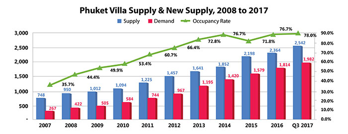 วิลล่าในภูเก็ตมีจำนวน 2,542 ยูนิตโดยประมาณ โดยในช่วง 9 เดือนแรกของปี 2560 มี 178 ยูนิตที่เพิ่มเข้ามาในตลาดวิลล่าภูเก็ต ส่วนใหญ่วิลล่าใหม่ๆ ที่เพิ่มขึ้นในช่วง 9 เดือนแรกของปีนี้เป็นวิลล่าประเภท 2 ห้องนอน ที่มีราคาขายอยู่ที่ 8-12 ล้านบาทต่อยูนิต และส่วนใหญ่ของอุปทานใหม่ตั้งอยู่ในศูนย์กลางของเกาะบริเวณหาดบางเทา หาดสุรินทร์ และหาดกมลา