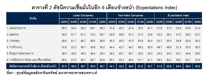 อย่างไรก็ตาม เมื่อจำแนกกลุ่มผู้ประกอบการฯ ตามประเภทบริษัท พบว่า ความเชื่อมั่นในภาวะปัจจุบันของผู้ประกอบการกลุ่มบริษัทจดทะเบียนในตลาดหลักทรัพย์ หรือ Listed Companies ประจำไตรมาส 2 ปี 2564 มีค่าดัชนีเท่ากับ 51.1 ซึ่งสูงกว่าค่ากลางที่ระดับ 50 และสูงกว่าไตรมาสก่อนหน้าที่มีค่าดัชนีเพียง 49.4 แสดงให้เห็นว่าผู้ประกอบการกลุ่ม บริษัทมหาชน มีความเชื่อมั่นต่อธุรกิจในภาวะปัจจุบัน