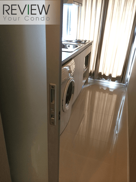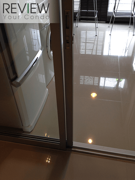 จุดวางตู้เย็นจะอยู่ติดประตูกระจกบานเลื่อนนะครับ ส่วนไฟฟ้าจะอยู่ด้านในติดกับโต๊ะทานอาหาร มีช่องใส่เครื่องซักผ้า และไมโครเวฟอยู่ด้านล่าง
