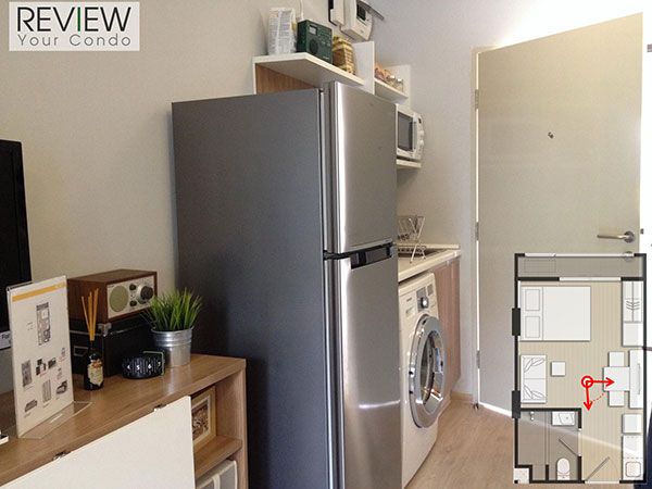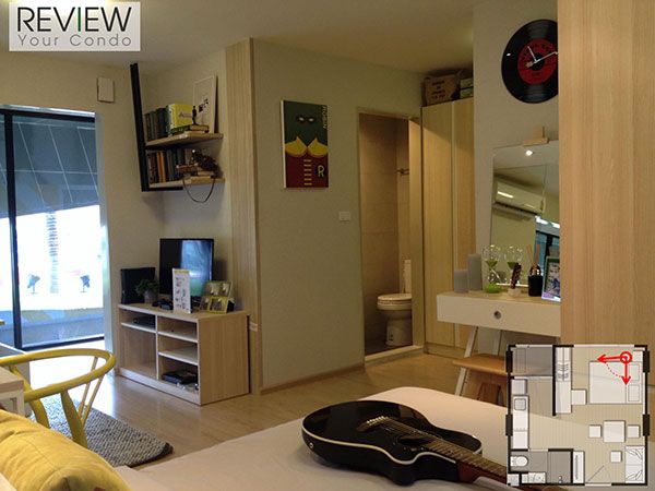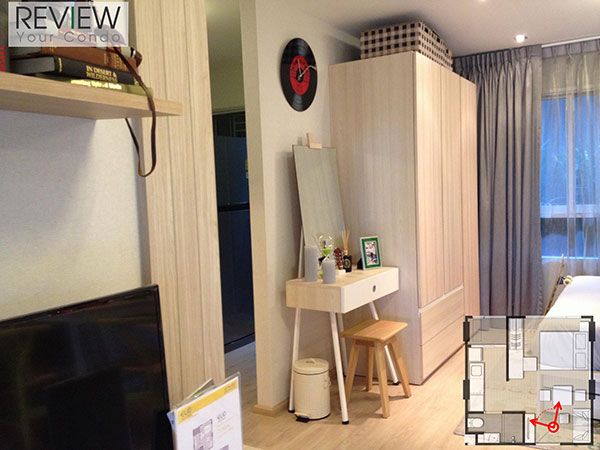 ส่วนห้องพักแบ่งออกเป็น 3 แบบหลักๆ เริ่มจากห้องแบบ Studio ขนาด 24 ตร.ม. ซึ่งกระทัดรัดเหมาะกับการอยู่คนเดียวมากกว่า เพราะพื้นที่ใช้สอยค่อนข้างจำกัด วางโต๊ะ ตู้ เตียง โซฟา ก็เกือบจะเต็มพื้นที่แล้ว ห้องใหญ่ขึ้นมาหน่อยเป็นแบบ 1 ห้องนอน ขนาดเริ่มต้นที่ 26 ตร.ม. ไปจนถึง 34 ตร.ม. จากห้องตัวอย่างที่มีให้ดูห้องแรกเป็นขนาด 26 ตร.ม. เปิดเข้ามาปุ๊ปก็เจอห้องนอนเลย ไม่ได้มีการกั้นพื้นที่ห้องนอนไว้แบบชัดเจนนัก แค่แยกพื้นที่ห้องครัวออกไปไว้ด้านเดียวกับห้องน้ำและระเบียง ต่างจากห้องตัวอย่างขนาด 34 ตร.ม. ที่เปิดเข้าห้องมาจะเจอห้องนั่งเล่นก่อน และห้องนอนจะถูกแยกไว้เป็นสัดส่วนมากกว่า แต่ก็แลกกับพื้นที่ห้องครัวที่ถูกย่อขนาดให้เล็กลง และย้ายไปไว้ตรงประตูทางเข้าแทน อันนี้ก็แล้วแต่ Life style ว่าชอบแบบไหนมากกว่ากัน