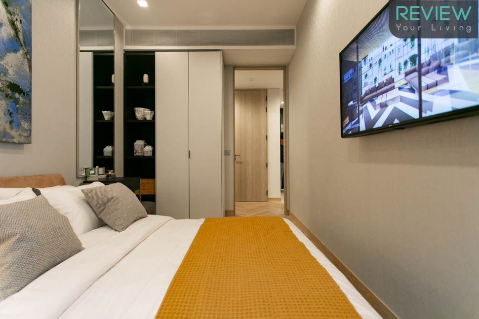 ภายใน Master Bedroom จะเป็นเตียง King Size วางอยู่กลางห้อง และยังคงเหลือพื้นที่ทางเดินได้รอบเตียงค่ะ