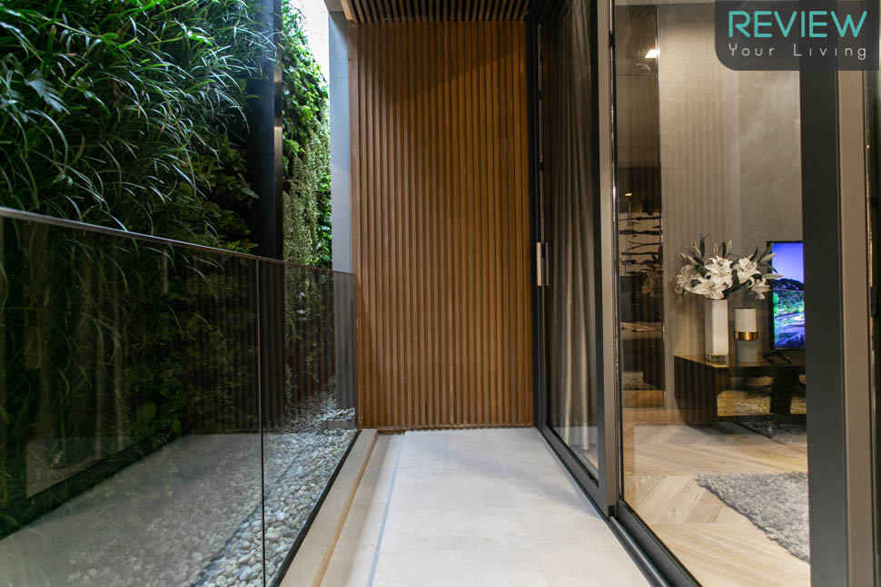 The Living Room ใต้อาคาร A เชื่อมต่อจาก Lawn Terrace กลางอาคาร ยังคงคุมโทนสีเข้มให้รู้สึกเหมือนอยู่ในป่า ซึ่งสามารถเปิดประตูกระจก High Ceiling บานใหญ่รับลมธรรมชาติจากภายนอกได้