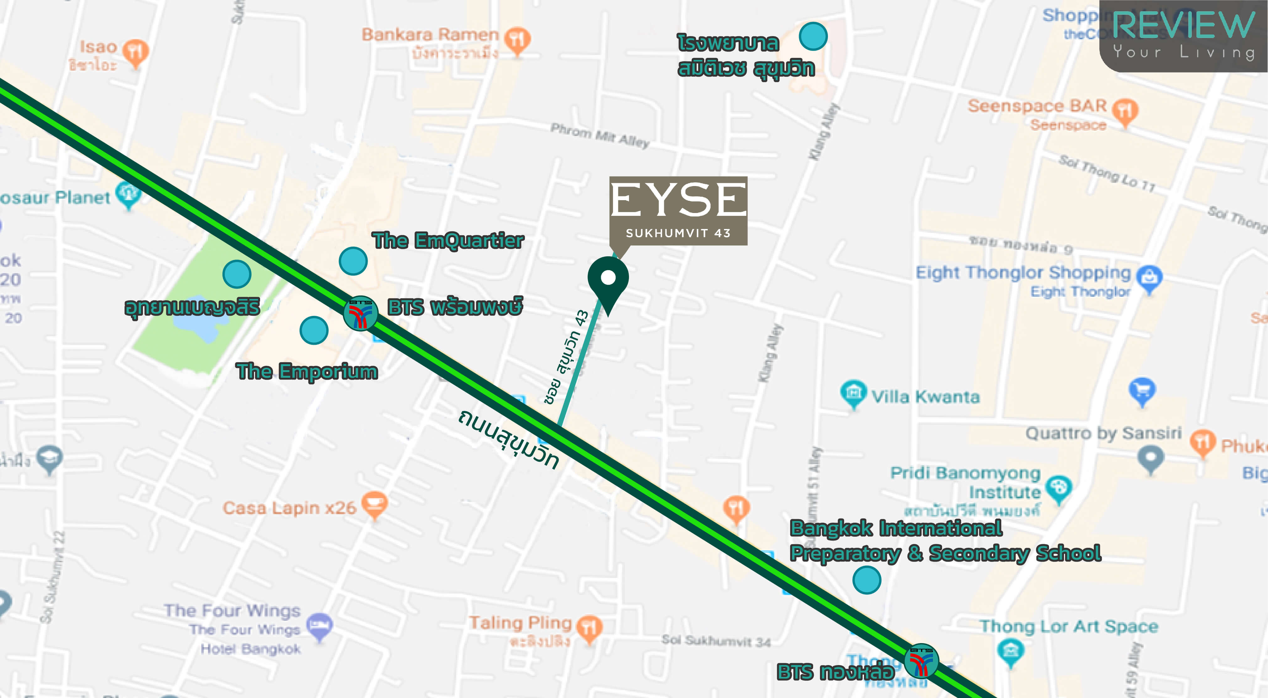 ซอยสุขุมวิท 43 ที่ตั้งของโครงการ EYSE SUKHUMVIT 43 ห่างจาก BTS สถานีพร้อมพงษ์ประมาณ 550 เมตร ซึ่งจาก BTS ก็จะผ่าน The EmQuartier และ Tops Market Sukhumvit 41 ระยะทางประมาณ 300 เมตร และจากปากซอยมาจนถึงตัวโครงการอีก 250 เมตร หรือจากปากซอย 43 เลยไปอีกประมาณ 900 เมตร ก็จะเป็นซอยสุขุมวิท 55 หรือซอยทองหล่อ อีกแหล่งรวมไลฟ์สไตล์สุดฮิปทั้งช่วงกลางวันและกลางคืนนั่นเอง และถึงแม้ว่าสุขุมวิท 43 จะเป็นซอยตัน แต่ส่วนใหญ่จะเป็นบ้าน 2 ชั้น ที่อยู่อาศัยกันมานานกับอาคารสูงไม่เกิน 8 ชั้นอยู่บ้าง จึงทำให้ได้บรรยากาศอันเงียบสงบ ท่ามกลางเมืองใหญ่ ให้อารมณ์ที่แตกต่างกันอยู่มากพอสมควร ระหว่างปากซอยกับในซอยสุขุมวิท 43 ตรงนี้จึงถือเป็น Hidden Gem Location ตามแบบฉบับของโครงการที่ตั้งใจวางคอนเซปนี้เอาไว้
