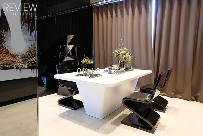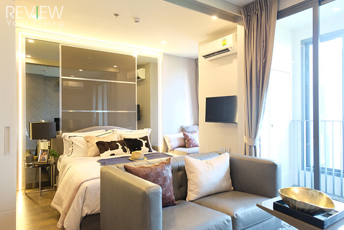 สำหรับห้องตัวอย่างที่เราได้ชมคือ ห้อง 1 Bedroom ขนาด 34 ตร.ม. ลักษณะห้องเป็นแบบหน้าแคบลึก พื้นที่ใช้สอยจัดมาได้ลงตัวทีเดียวค่ะ ซึ่งแต่ละยูนิตจะมี Private Lift ขึ้นมาที่ห้องเลย ห้องนี้เปิดมาจะเจอส่วนครัวพอดี ซึ่งจะมีประตู 2 ชั้นคือประตูที่เดินออกไปตรง Corridor และประตูที่เดินเข้าห้องด้านใน พื้นที่ภายในเป็นส่วนพักผ่อนอย่างห้องนอนและมุมนั่งเล่น ด้านในสุดเป็นระเบียง ประตูห้องนอนจะได้แบบบานเลื่อน 3 ตอน สามารถเปิดปิดแยกส่วนจากห้องนั่งเล่นได้ ในห้องนอนมีพื้นที่วางโต๊ะ ตู้ เตียง ได้ครบ ส่วนห้องน้ำจะอยู่ในห้องนอนนะคะ ซึ่งในห้องตัวอย่างทางโครงการก็ตกแต่งแบบจัดเต็มเพื่อให้เราได้เห็นฟังก์ชั่นการใช้งานของห้องได้อย่างชัดเจนมากขึ้น แต่ห้องที่ขายจริงจะเป็นห้องโล่งๆ ที่ได้เพียงผนังฉาบเรียบสีขาว กับ Fully Fitted ตามมาตรฐานที่กล่าวมาข้างต้นเท่านั้นค่ะ