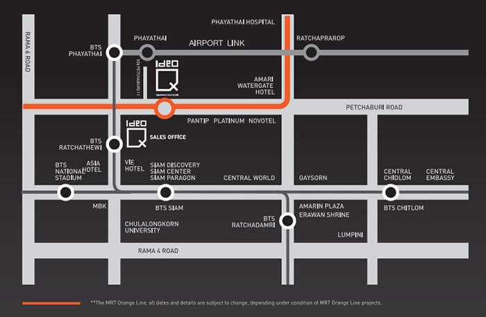 โครงการ ไอดีโอ คิว สยาม-ราชเทวี ตั้งอยู่บนทำเลที่น่าสนใจจริงๆ ค่ะ ตัวโครงการอยู่ติดถนนถนนเพชรบุรี (เพชรบุรีซอย 11) ฝั่งมุ่งหน้าไปทางแยกประตูน้ำ ห่างจากแยกราชเทวีมาประมาณ 300 เมตร และห่างจากแยกประตูน้ำประมาณ 700 เมตร จุดเด่นของโครงการคือตั้งอยู่ใจกลางเมือง ใกล้ CBD, แหล่งงาน, ห้างสรรพสินค้าชั้นนำมากมาย สามารถเชื่อมต่อออกไปยังที่ต่างๆ ได้สะดวก ซึ่งตอบโจทย์ลูกบ้านทั้งคนมีรถและไม่มี โดยมีให้เลือกหลากหลายเส้นทางไม่ว่าจะเข้าหรือออกเมือง พร้อมทั้งอยู่ใกล้ทางด่วน และมีซอยย่อยที่ลัดเลาะไปได้โดยไม่ต้องใช้เส้นหลัก อย่างที่ทราบกันดีอยู่แล้วว่าถนนเพชรบุรีเป็นถนนเส้นสำคัญของย่านนี้เลยก็ว่าได้ โดยตัวถนนเพชรบุรีจะเริ่มตั้งแต่บริเวณแยกยมราช มาตัดกับถนนพระราม 6 (แยกอุรุพงษ์) ตัดกับถนนบรรทัดทองตรงแยกเพชรพระราม และมาตัดกับถนนพญาไทบริเวณแยกราชเทวี จากนั้นมาตัดกับถนนราชปรารภและถนนราชดำริบริเวณแยกประตูน้ำ นอกจากนี้ยังไปตัดกับถนนชิดลม, ถนนวิทยุ, ถนนนิคมมักกะสัน และซอยสุขุมวิท 3 ที่ตัดกับถนนอโศก-ดินแดงและอโศกมนตรี ตัดกับซอยเพชรบุรี 38/1 ตัดกับซอยสุขุมวิท 63 (เอกมัย) และไปสิ้นสุดที่แยกคลองตันโดยตัดกับถนนรามคำแหง, ถนนพัฒนาการ และสุขุมวิท 71