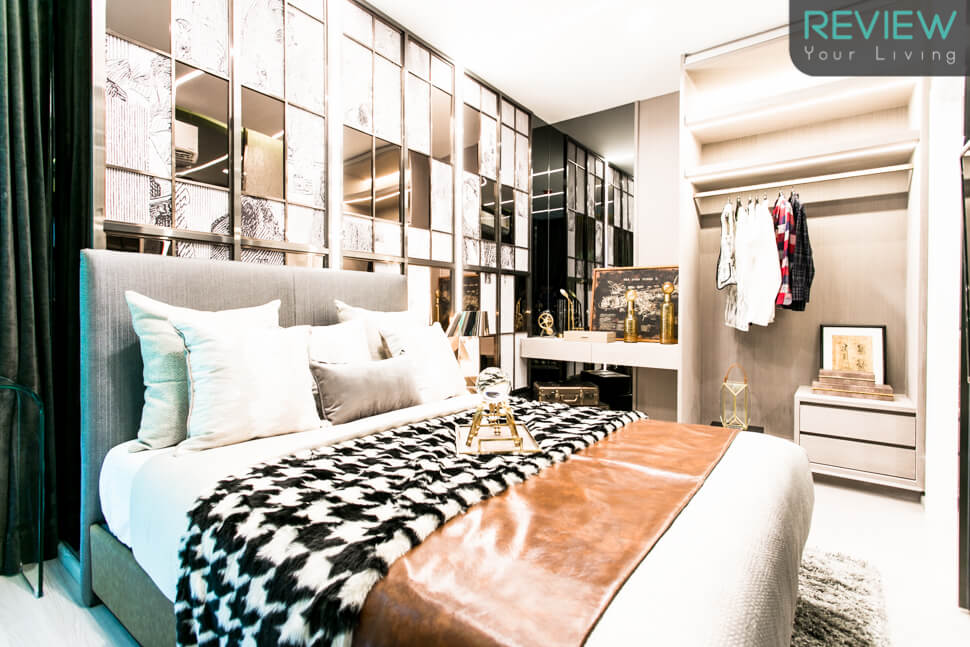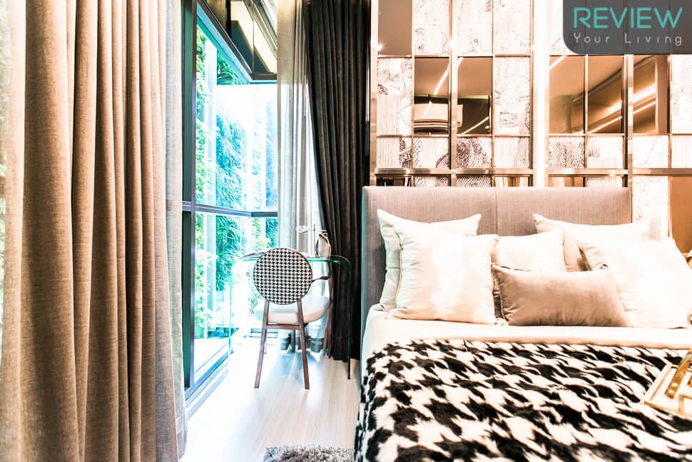 สุดท้ายที่ห้องนอนฝั่งขวามือของห้องค่ะ เป็นห้องที่วางเตียง 5 ฟุตไว้กลางห้อง พร้อมมีพื้นที่สำหรับ Built in ตู้เสื้อผ้า โต๊ะเครื่องแป้งได้ สำหรับห้องนี้มีจุดเด่นตรงที่ได้ Space ข้างหน้าต่างกระจก Full Height มีกระจกเข้ามุม ลึกเข้าไปจากหัวเตียง ทำให้เทควิวด้านนอกได้กว้าง ให้ความรู้สึกโปร่งโล่งได้มากกว่า