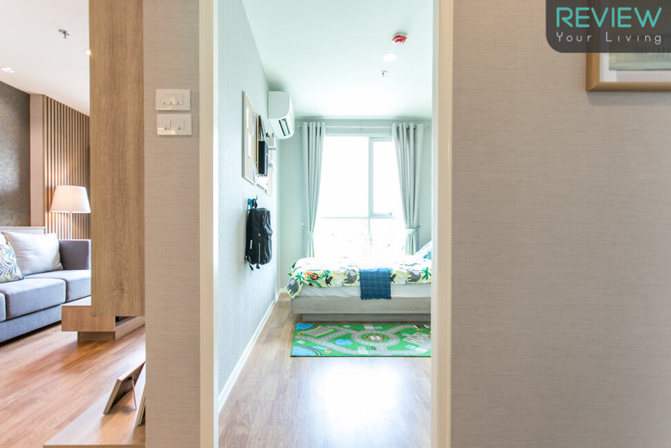 ห้องตัวอย่างถัดมาค่ะ ส่วนแรกของห้องจะลึกเข้าไปด้านใน แยกโซน Bedroom เอาไว้ทางขวา ซึ่งห้อง Type นี้จะได้เครื่องปรับอากาศ 2 ตัวค่ะ