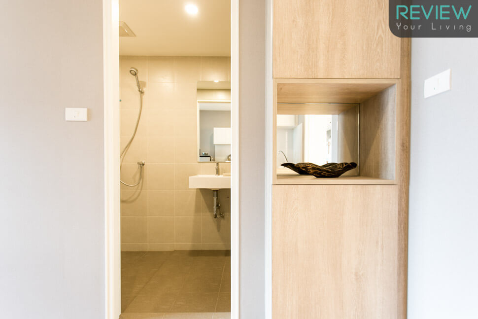 ขวามือเป็นห้องน้ำ มี Built in ตู้เก็บของที่เจาะช่องว่างเอาไว้ตรงกลาง