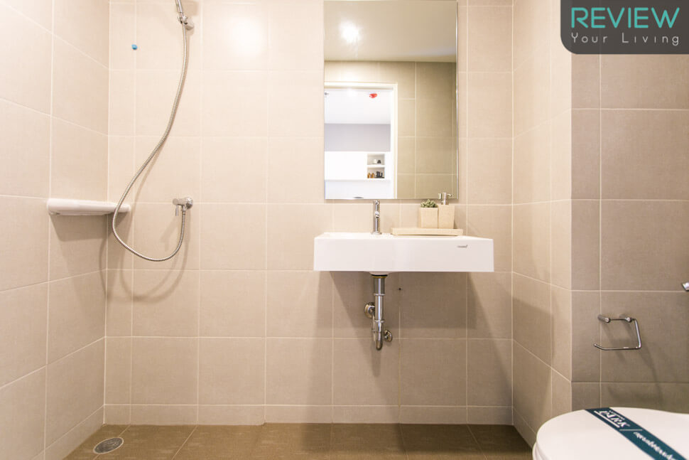 ภายในห้องน้ำทั้งพื้นและผนังจะถูกปูด้วยกระเบื้องเซรามิคสีเทา แยกส่วนเปียก-แห้งเอาไว้คนละฝั่งกัน