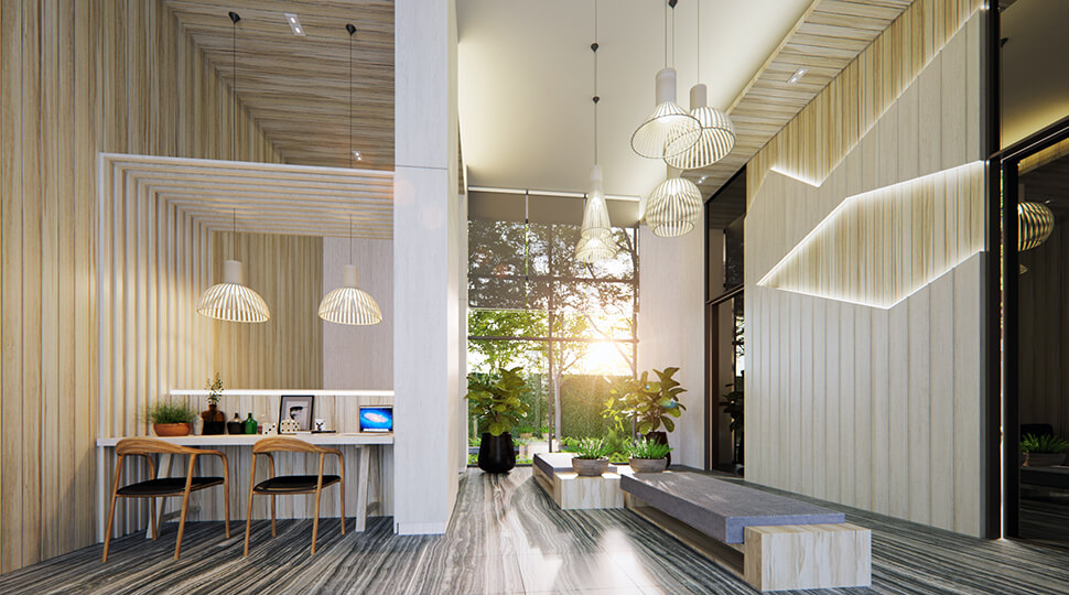 พื้นที่ภายในอาคารชั้นล่างถูกจัดแต่งให้เป็น Co-living Area สำหรับรับแขก และยังเป็นพื้นที่เปลี่ยนบรรยากาศการพักผ่อนของลูกบ้านได้อย่างลงตัว