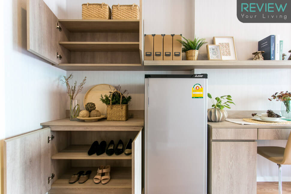 ตรงข้ามกับเคาน์เตอร์ครัวมี Built in ตู้เก็บรองเท้า ส่วนด้านบนมีชั้นเก็บของ และช่องว่างสำหรับวางตู้เย็นได้พอดีค่ะ
