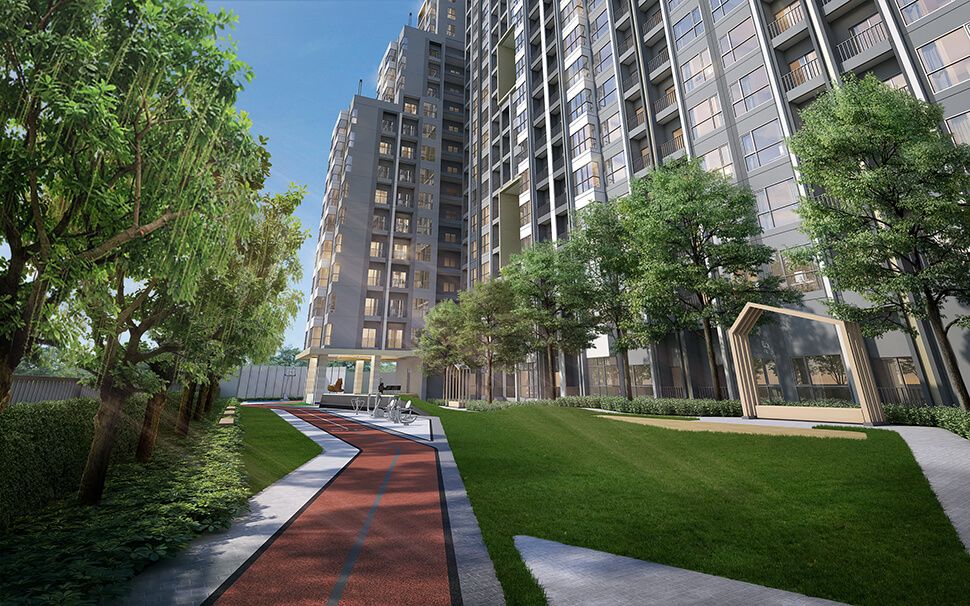ชั้นล่างสุดของอาคารคอนโดมิเนียม และอาคารจอดรถทางด้านขวา รอบๆ ตัวคอนโดมิเนียมมีลู่วิ่ง หรือสำหรับขี่จักรยานเป็นวงกลมได้รอบตึก มีมุมสนามสตรีทบาส และพื้นที่สวนสีเขียวสำหรับนั่งพักผ่อน