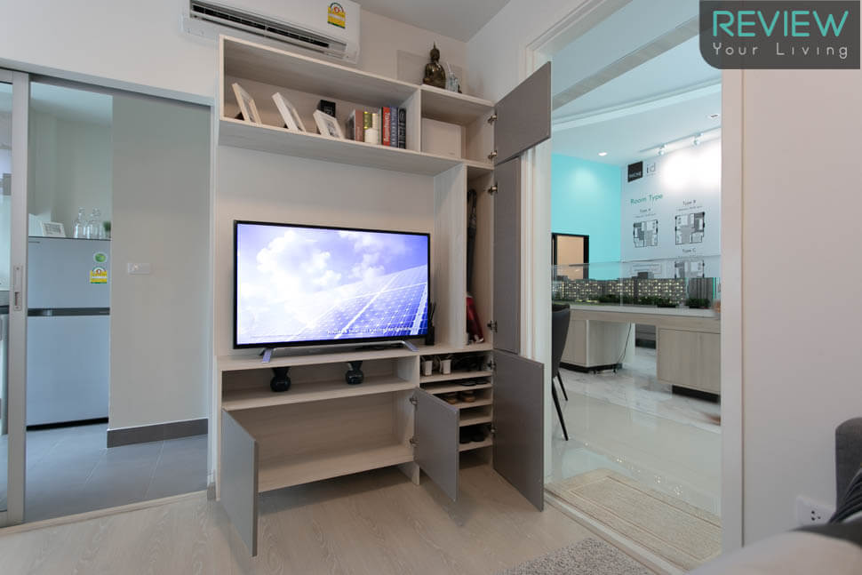 เคาน์เตอร์วางทีวีจะได้หน้าตาแบบนี้มาทั้งเซตเลยค่ะ ไม่ว่าจะเป็นชั้นใส่รองเท้า เก็บร่ม ชั้นวางหนังสือก็ได้ทั้งนั้น เรียกได้ว่าเป็นตู้อเนกประสงค์จริงๆ ค่ะ แต่ยกเว้นเพียงทีวีกับเครื่องปรับอากาศที่ห้องนั่งเล่นเท่านั้นที่ไม่ได้มาด้วย