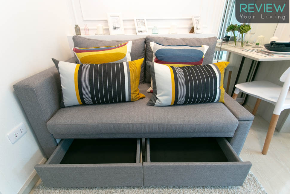 ตรงข้ามกับเคาน์เตอร์ทีวีจะได้โซฟาผ้าสีเทาขนาด 2 ที่นั่ง โดยใต้โซฟาจะซ่อนลิ้นชักเก็บของเอาไว้ให้ 2 ช่องค่ะ