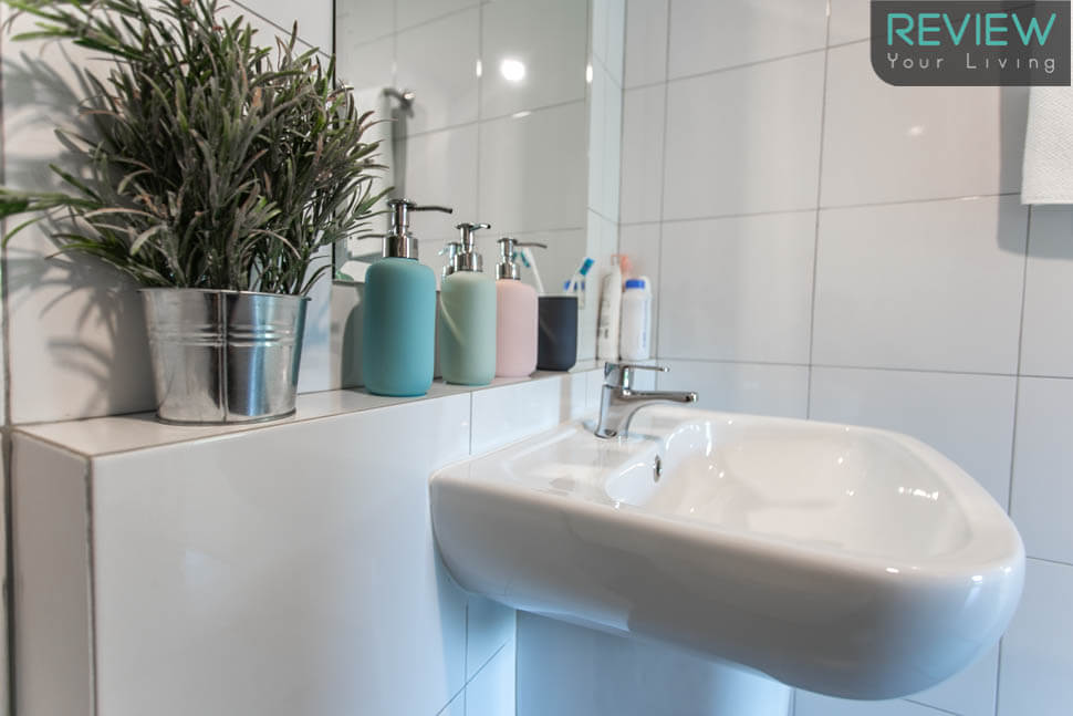 ห้องน้ำพื้นและผนังปูด้วยกระเบื้องเซรามิค โดยจะเป็นส่วนแห้งก่อนส่วนเปียกด้านในค่ะ