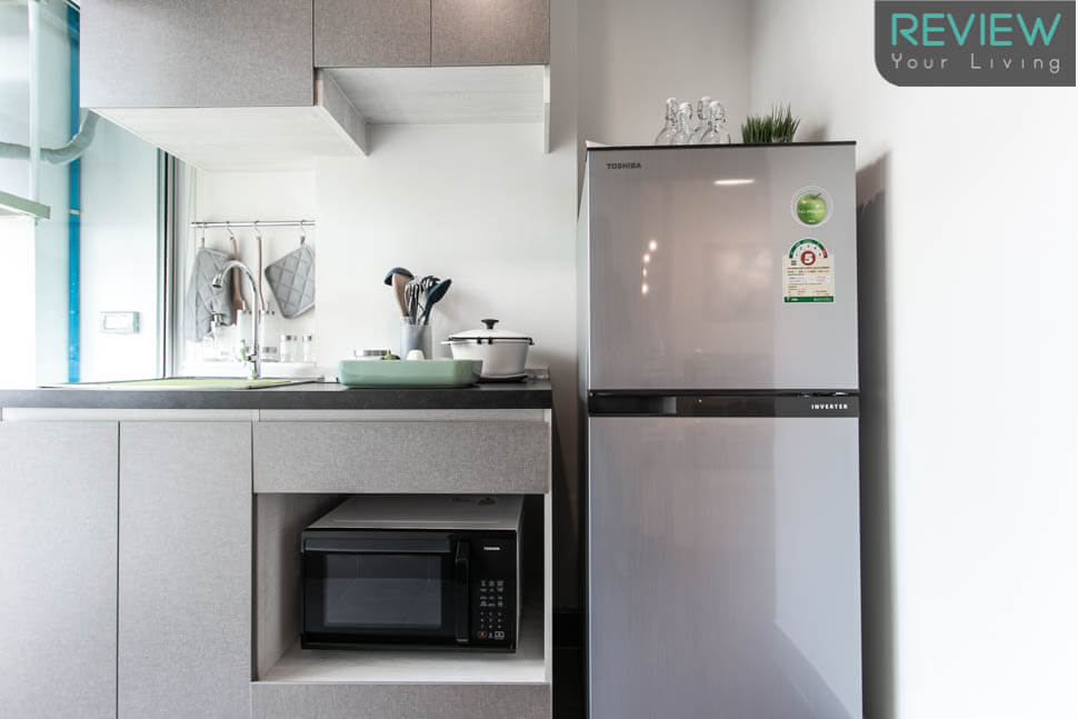 สิ่งที่ทางโครงการจะให้มาด้วยนั่นคือ Built in เคาน์เตอร์ครัวครบเซตจากแบรนด์ Modernform มีช่องสำหรับวางตู้เย็นอยู่ข้างเคาน์เตอร์ครัว