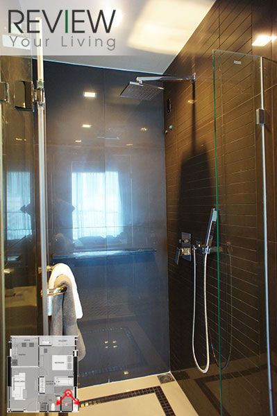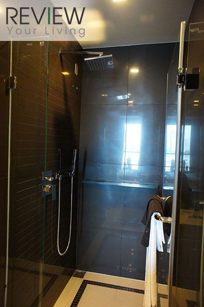 อีกด้านเป็นห้องอาบน้ำ ซึ่งกันกระจกเทมเปอร์ พร้อมชุดฝักบัวแบบ rain shower มาให้เรียบร้อย