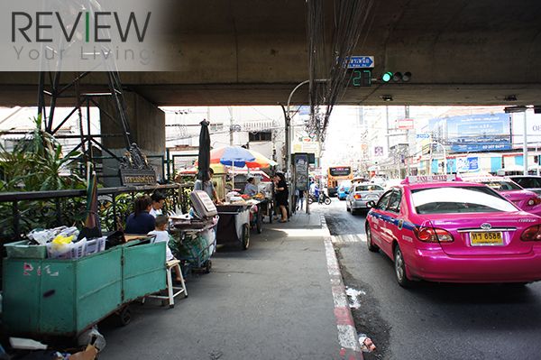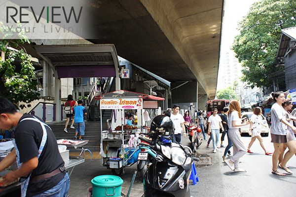 พอข้ามถนนมาแล้ว จะเห็นว่าบริเวณนี้มีรถเข็นแผงลอยเรียงรายเต็มเลย ได้บรรยากาศแบบวิถีชุมชนมากๆ เดินตรงไปอีกหน่อยก็จะถึงทางขึ้นสถานีรถไฟฟ้าแล้วครับ