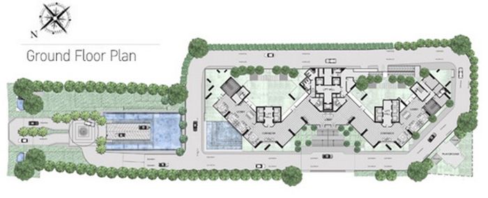 แปลนอาคารที่ชั้นแรกครับ จะเห็นว่าจากทางเข้าหน้าโครงการมาก็จะตรงดิ่งลงสู่ลานจอดรถใต้ดินเลยนะครับ และตัวอาคารทั้ง 2 ตึกก็เรียงตัวกันเป็นรูป W ชัดเจน
