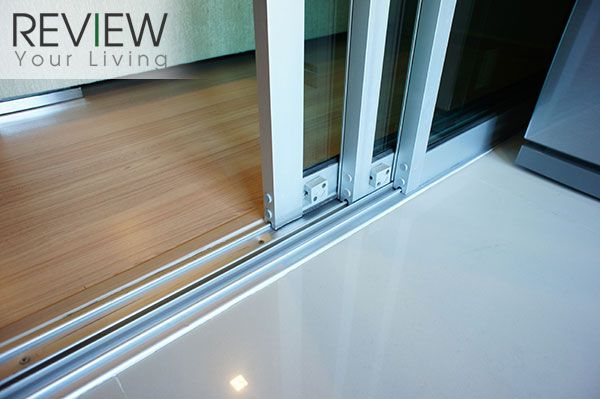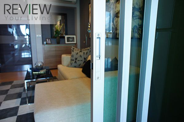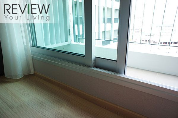 ประตูระเบียงเป็นกระจกบานเลื่อนที่หนาและหนักเอาเรื่องเลยครับ ออกแบบมาได้แน่นหนามากๆ ส่วนธรณีประตูก็กั้นไว้สูงเลยทีเดียว เวลาเดินเข้าออกต้องระวังสะดุดกันหน่อยครับ
