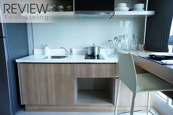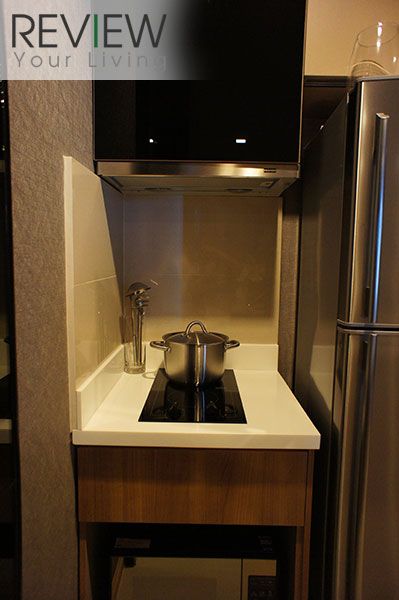 ติดตั้งเตาไฟฟ้า และเครื่องดูดควันไว้ในมุมเล็กๆ ติดกับตู้เย็นเลย อย่างที่บอกว่าไม่เหมาะกับการทำกับข้าวหนักๆ เลยนะครับห้องนี้ เน้นเอาไว้อุ่นอาหารเล็กๆ น้อยๆ มากกว่า