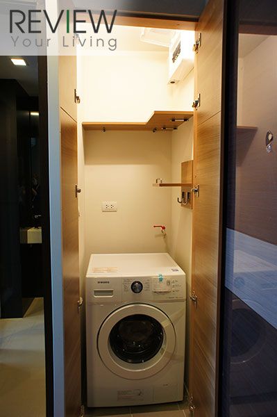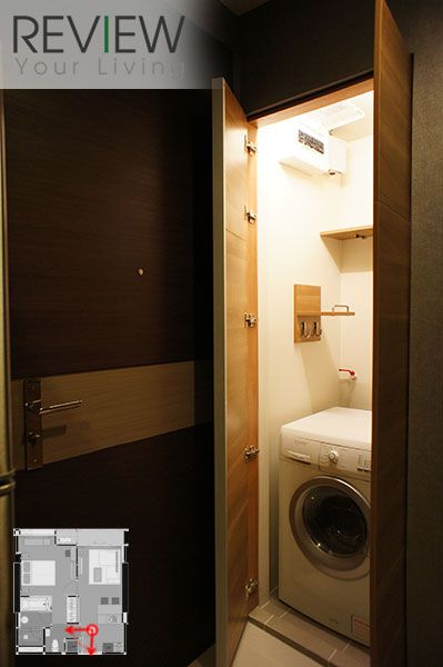 ด้านขวาของประตูทางเข้าห้อง จะมีห้อง Laundry Room ซ่อนเครื่องซักผ้า และมีชั้นเก็บของ Built-in มาให้เป็นระเบียบเรียบร้อย