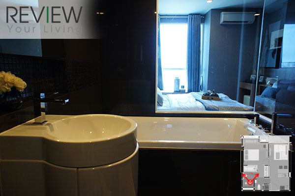 ห้องอาบน้ำออกแบบมาเซ็กซี่มากเลยนะครับ เพราะติดกระจกเข้ามุมตรงอ่างอาบน้ำพอดีเลย ถ้าไม่ได้เป็นคนเปิดเผยมากๆ ก็สามารถติดม่านเพิ่มได้ ส่วนห้องส้วมจะแยกออกมาต่างหากนะครับ