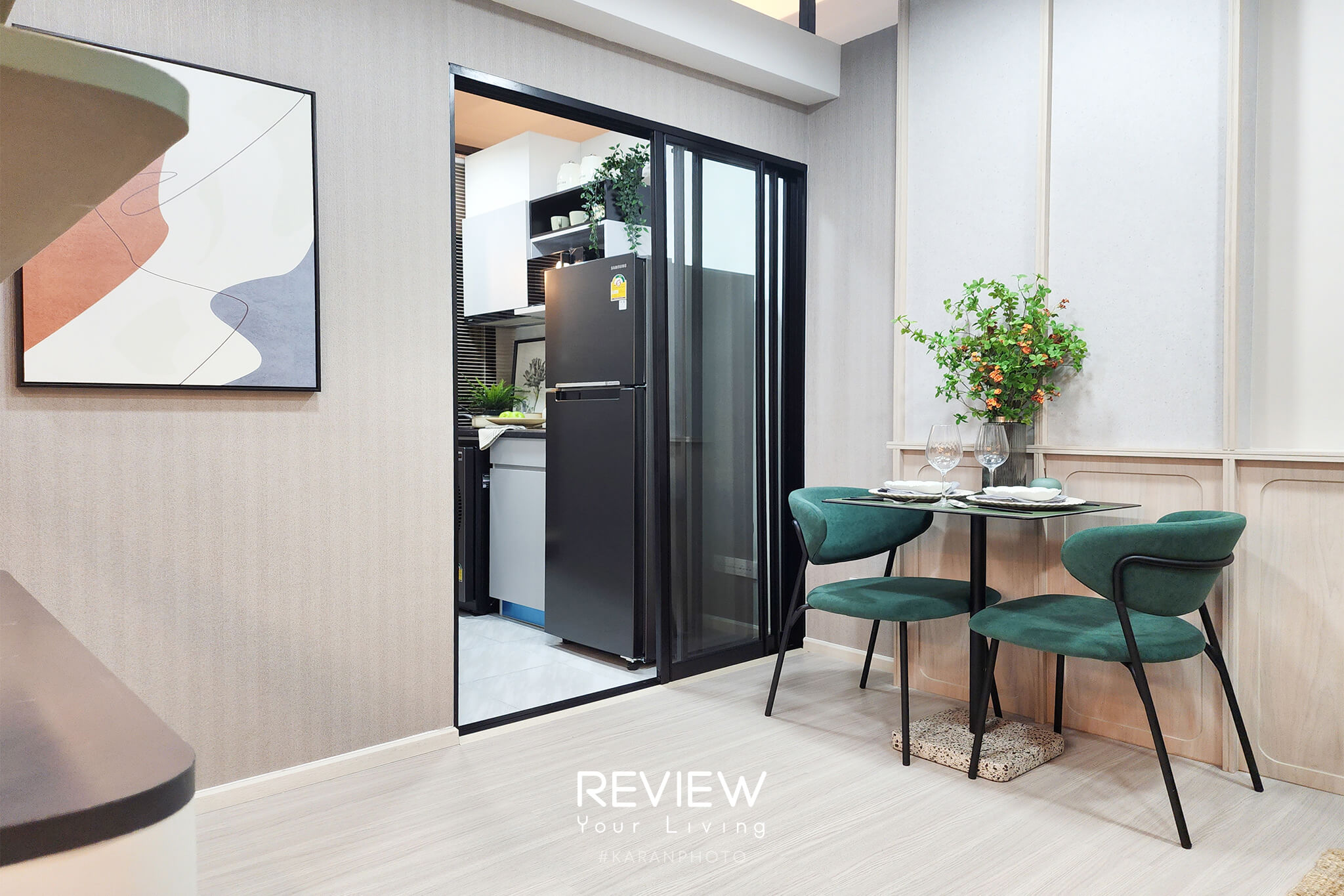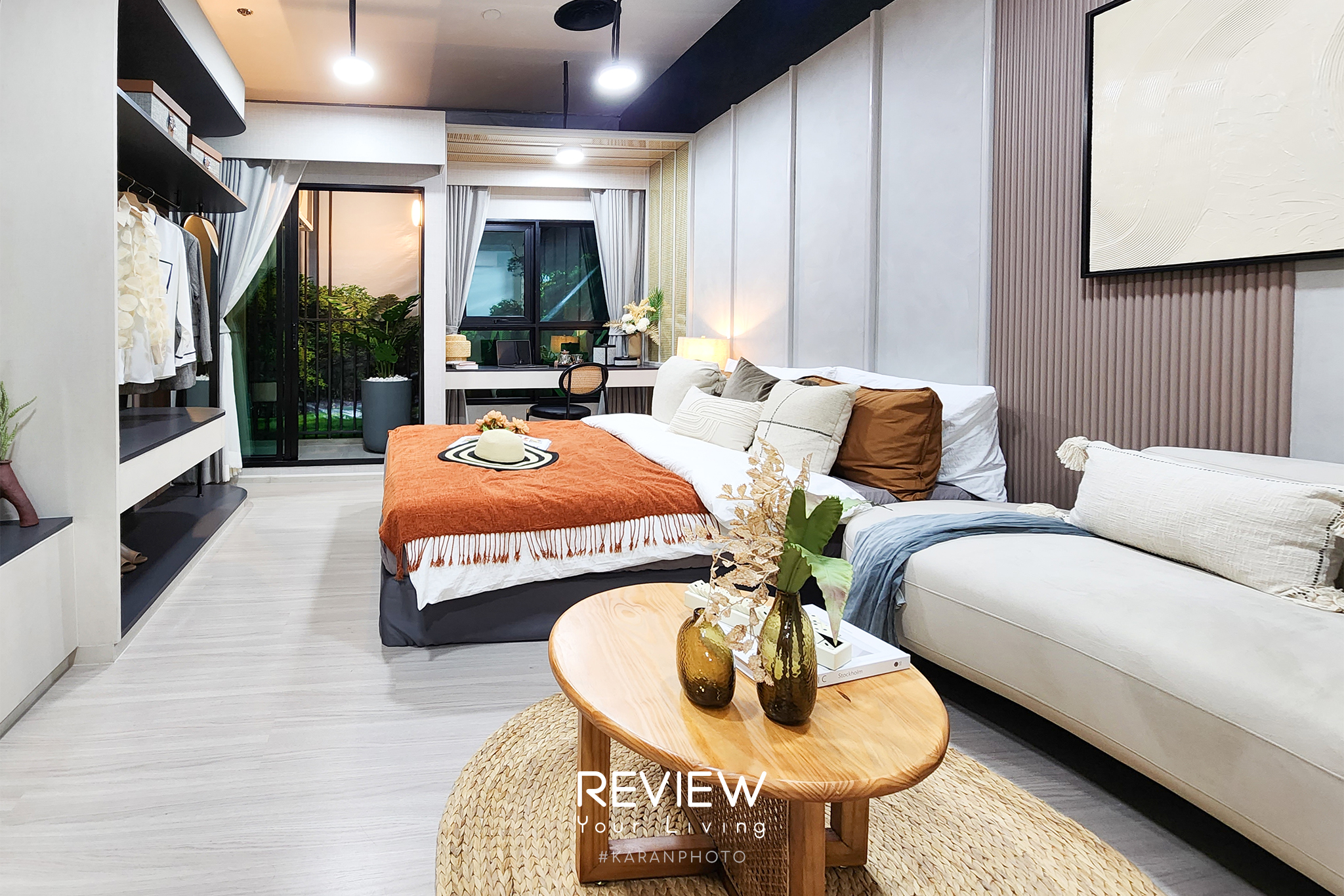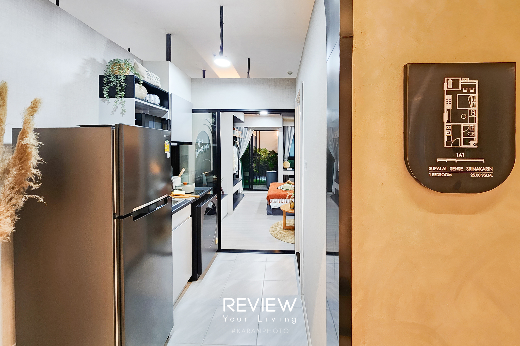 ห้องตัวอย่างอีกห้อง เป็นห้อง 1 Bedroom ขนาด 25 ตารางเมตร (1A1) ซึ่งเป็นรูปแบบที่กะทัดรัดลงมาหน่อย แต่ยังคงความเป็นสัดส่วน เปิดเข้าห้องมาจะเจอกับครัวปิด มีประตูกระจกกั้นครัวให้แยกจากพื้นที่นั่งเล่นและห้องนอนชัดเจน พื้นที่ด้านในเป็น Living Area เปิดกว้างที่มีมุมนั่งเล่นกับที่นอนแชร์พื้นที่ร่วมกัน นอกจากนี้ยังมีมุมเล็กๆ บริเวณริมหน้าต่าง สำหรับตั้งโต๊ะทำงานหรือใช้เป็นมุมอ่านหนังสือได้พอดี เหมาะกับการอยู่อาศัยคนเดียวง่ายๆ หรือเหมาะกับการปล่อยเช่าเช่นกัน