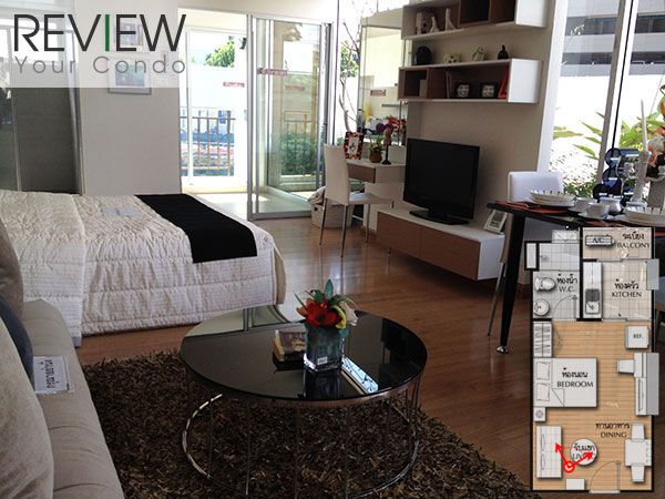 ส่วนห้องแบบ 1 ห้องนอน มีขนาดตั้งแต่ 42.5-45 ตร.ม. พื้นที่ใช้สอยภายในห้องจัดว่ากว้างขวางเลยทีเดียว เปิดประตูเข้ามาก็จะเจอส่วนของห้องนั่งเล่นที่ดูโล่งสบายตาดี การจัดสรรพื้นที่ในห้องทำมาแบบหลวมๆ ด้านหลังชั้นวางทีวีจะเป็นห้องน้ำ ซึ่งอยู่ในแนวเดียวกันกับห้องครัว แน่นอนว่าพื้นที่ห้องครัวยังคงจัดสรรมาให้กว้างมากพอที่จะทำครัวได้อย่างเป็นเรื่องเป็นราว สำหรับห้องแบบ 1 ห้องนอนนี้ พื้นที่ห้องนอนจะดูเป็นสัดส่วนมากยิ่งขึ้น แต่ก็ไม่อึดอัดเกินไป เพราะประตูห้องเป็นประตูกระจกบานเลื่อน ทำให้แสงสว่างส่องมาถึงห้องนั่งเล่นได้ และช่วยให้บรรยากาศโดยรวมภายในห้องโปร่งมากขึ้นครับ