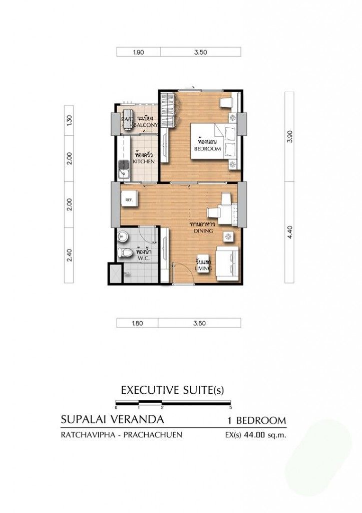โมเดลของห้องขนาด 44.0 ตร.ม.