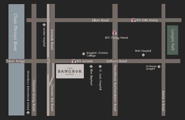 ทำเลที่ตั้งโครงการอยู่ในย่านธุรกิจใจกลางเมือง บริเวณรอบๆ จะมีบรรยากาศแบบเมืองใหญ่ ล้อมรอบไปด้วยอาคารสำนักงาน คอนโดมิเนียม และตึกสูงเสียเป็นส่วนใหญ่ แต่โชคดีที่โครงการ The Bangkok Sathorn ยึดพื้นที่หัวมุมถนน ทางด้านทิศตะวันตกซึ่งติดกับถนนเจริญราษฎร์จึงเป็นมุมที่มีวิวในมุมกว้างที่สุด ถ้าอยู่ในชั้นสูงๆ ก็อาจจะสามารถเห็นวิวไกลไปถึงแม่น้ำเจ้าพระยาเลยทีเดียว นอกเหนือจากนี้ห้องส่วนใหญ่ก็ได้วิวสวยๆ ของในเมืองกันแบบเต็มๆ ตา