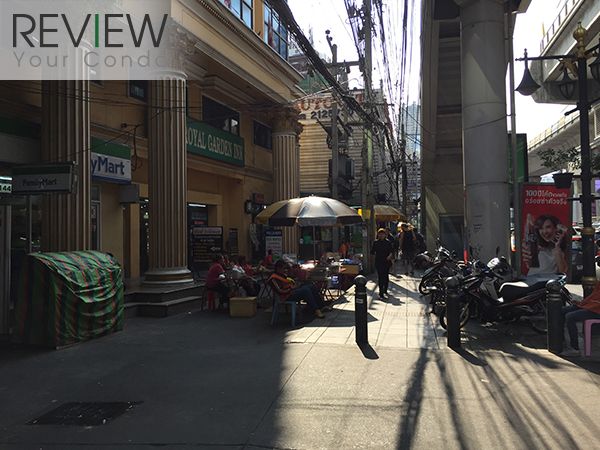 ตึกเหลืองๆ นี่คือตึก King Royal Garden Inn มี Family Mart และร้านขายของอยู่หน้าตึกให้พอฝากท้องได้บ้าง