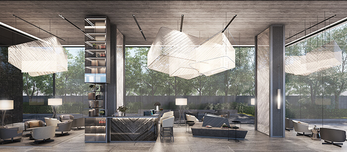 ภาพจำลองบรรยากาศภายใน Lobby มีรายละเอียดการตกแต่งและการเลือกใช้วัสดุที่หรูหราที่ผสมความเป็นไทยและสากลเข้าไว้ด้วยกัน