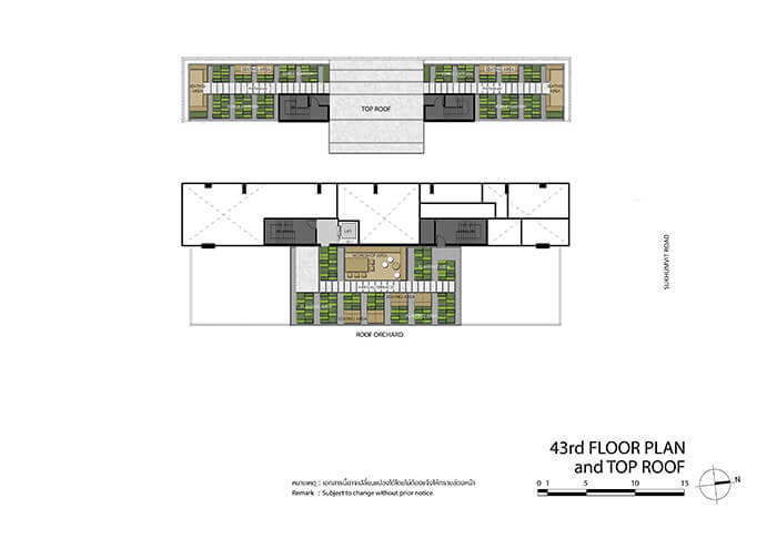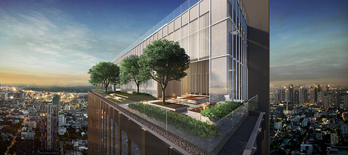 ภาพจำลองมุมสูงบริเวณชั้น 41-43 เป็นลักษณะของ Sky Terrace แบบ Open Air การออกแบบจึงใช้ Slope ไล่ระดับลงไป ซึ่งพื้นที่ทั้ง 3 ชั้นนี้นอกจากจะเป็นพื้นที่ชมวิวของโครงการแล้ว ยังช่วยพื้นที่สีเขียวที่ลดความร้อนให้แก่ชั้นพักอาศัยได้ด้วย