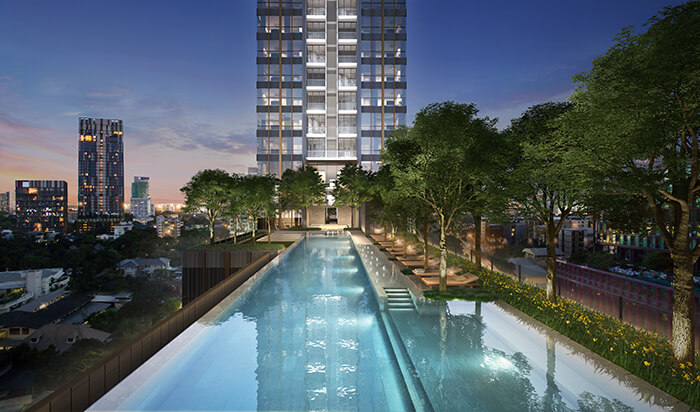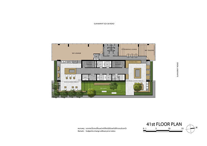 ในส่วนของพื้นที่ส่วนกลางทางโครงการก็จัดเต็มแบบสุดๆ เรียกว่าครบครันมากทีเดียวค่ะ ซึ่งคอนเซ็ปต์ของพื้นที่ส่วนกลางถูกออกแบบโดยหลอมรวมความต้องการใช้ชีวิตแบบสังคมเข้ากับความเป็นส่วนตัว สู่รูปแบบของ Facility ที่มีทั้งฟังก์ชั่นการใช้งานร่วมกัน และแยกเป็นส่วนตัว เริ่มจากชั้น 1 เป็นพื้นที่ของล็อบบี้, ตู้จดหมายและห้องเก็บของ, ซังเคน ลอว์น ที่เปรียบเสมือนสวนหน้าบ้าน และที่จอดรถซึ่งสามารถจอดได้มากถึง 100% (รวมจอดซ้อนคัน) สำหรับ Facility บนอาคารจะเริ่มที่ชั้น 7-8 และ 41-43 และดาดฟ้า ประกอบด้วย วอเตอร์ การ์เด้น, สระว่ายน้ำพร้อมสระเด็ก, ห้องสปา, ฮอริซอน ออนเซ็น, ห้องสำหรับเด็ก, ห้องอบไอน้ำ, ฟิตเนส, เวอร์ชัวร์ ไบค์, กอล์ฟ ซิมูเลเตอร์, สกาย เลาจน์ พื้นที่อเนกประสงค์, เดอะ เรสซิเดนซ์ เลาจน์ พื้นที่สำหรับจัดเลี้ยง, สกาย เทียเตอร์ ห้องชมภาพยนตร์ส่วนตัว, บาร์บีคิว เดค และที่ขาดไม่ได้เลยคือ ไรซ์ ฟิล์ด การ์เด้น ชั้น 41 และรูฟ ออชาร์ด บริเวณชั้น 43 และชั้นดาดฟ้า ที่ทางโครงการนำความเขียวขจีของธรรมชาติเข้าไปใส่ไว้ ให้ความรู้สึกเหมือนชานบ้านเรือนไทยที่มีทุ่งนา ภูเขา สวนบัว นาขั้นบันได และสวนผักรายล้อมอยู่รอบๆ นอกจากนี้ยังมาพร้อมกับระบบรักษาความปลอดภัยตลอด 24 ชม. และยังมีบริการ Wifi ที่บริเวณพื้นที่ส่วนกลางทุกชั้นอีกด้วย