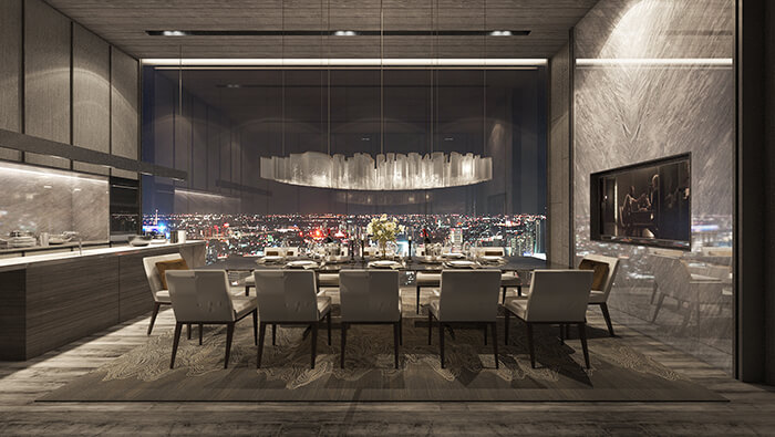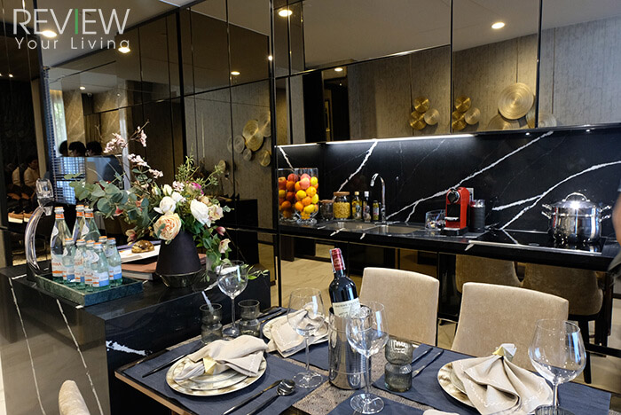 ภาพจำลองบรรยากาศในส่วนของ PRIVATE DINING พื้นที่ส่วนกลางที่ลูกบ้านสามารถขอใช้งานจัดปาร์ตี้เล็กๆ ได้ โดยจะมีไอส์แลนด์ และโต๊ะทานอาหารไว้ให้บริการ