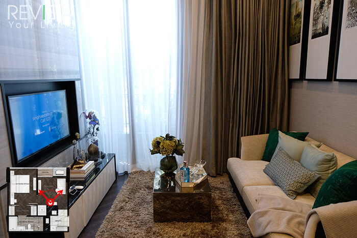 ระยะดูทีวีของห้องนั่งเล่น มีระยะห่างประมาณ 2.4 เมตร มีขนาดทีวีที่เหมาะสมอยู่ที่ 50 นิ้ว พื้นที่ทางเดินนี้เมื่อวางโต๊ะกลางแล้วก็ยังเหลือพื้นที่ให้เดินผ่านเข้าไปยังระเบียงได้ด้วยค่ะ