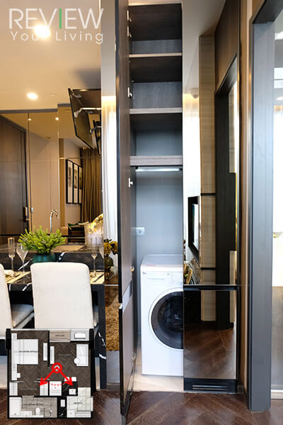 ทางโครงการ Built-in ตู้เก็บเครื่องซักผ้าพร้อมปลั๊กไฟมาให้ติดกับประตูห้องนอนเลยนะคะ หน้าบานเป็นบานกระจกแบบ Coated Glass Panel with Aluminium Edge ทำให้ได้ความเงาของกระจกด้านหน้าที่ช่วยเพิ่มความหรูหรา แต่ก็ไม่สามารถมองเห็นสิ่งของด้านใน