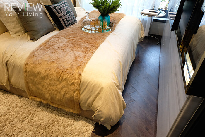พื้นที่รอบเตียงสามารถเดินได้โดยรอบเลยนะคะ พื้นเป็น Engineering Wood สี Dark Brown ลายก้างปลาให้ความรู้สึกเหมือนบ้านเรือนไทยสมัยก่อน