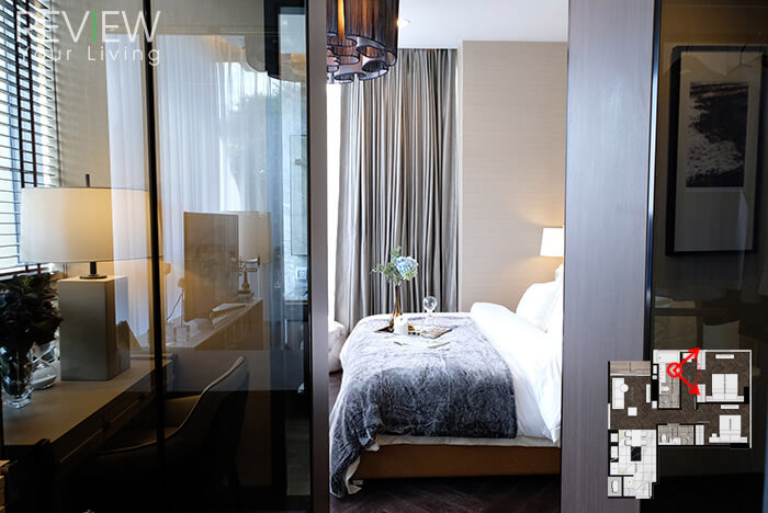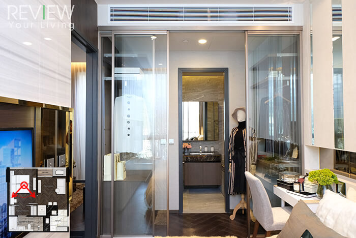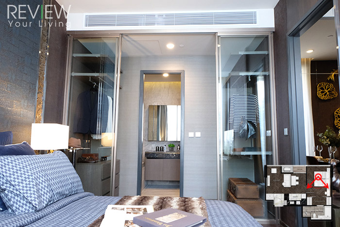 เครื่องปรับอากาศภายในห้องเป็นแบบ Concealed Split เหมือนกับห้องตัวอย่างแรกเลยนะคะ ภายในห้องนอนอีกฝั่งหนึ่งเป็นห้องน้ำ และส่วนของ Walk-in Closet ที่มีประตูกระจกใสบานเลื่อนกั้นค่ะ