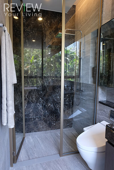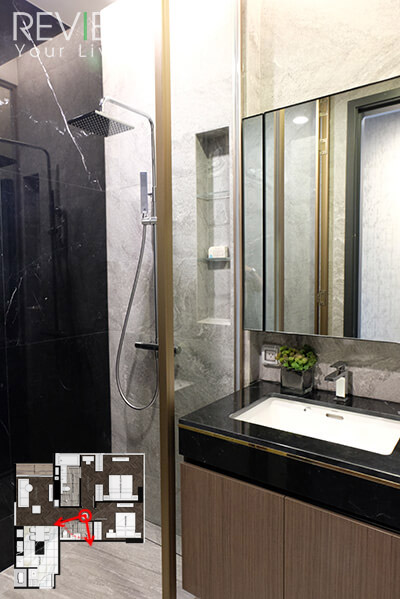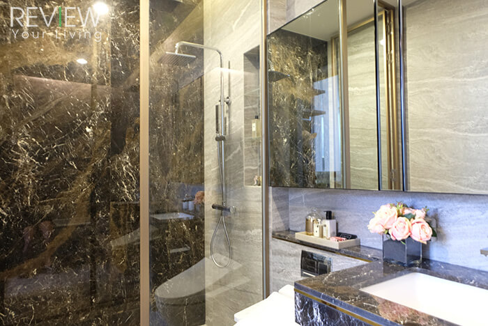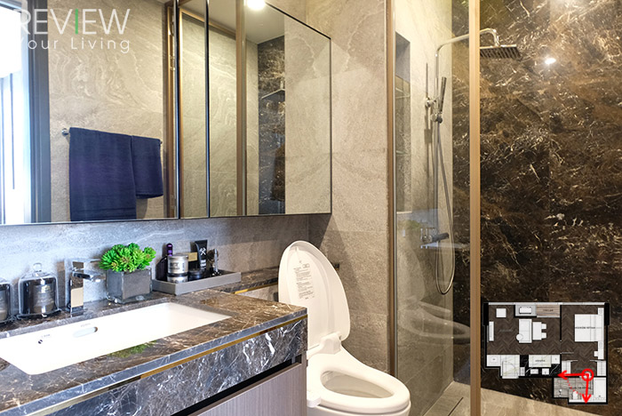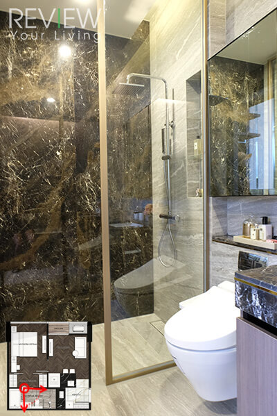 อีกฝั่งจะเป็นพื้นที่อาบน้ำส่วนเปียก ฉากกั้นเป็นกระจก ผนังฝั่งหนึ่งถูกตกแต่งให้สวยงามด้วยด้วยหินอ่อนสีเข้ม