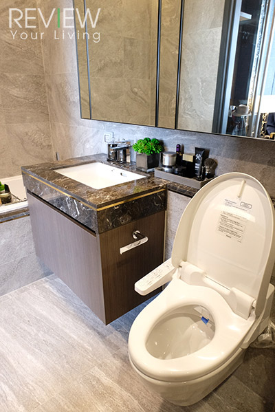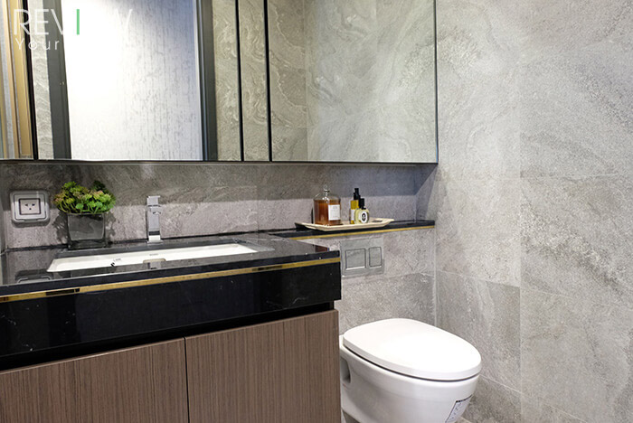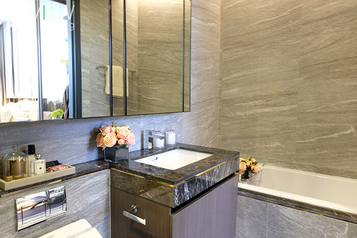 เคาน์เตอร์ล้างหน้าจะบิลต์อินดั่งภาพเลยนะคะ รอบๆ อ่างกรุด้วยหินอ่อนนำเข้าทำให้ดูหรูหรามากขึ้น ตัว ส่วนกระจกเงาจะได้เต็มบานแบบนี้เลยนะคะ