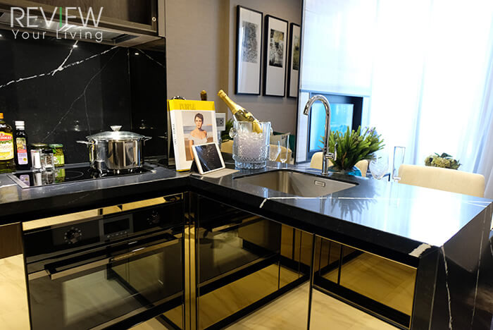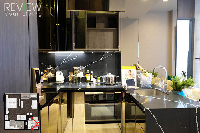 Counter ครัวจะเป็นรูปแบบตัวแอล (L) จะได้วัสดุเหมือนอย่างในห้องตัวอย่างก่อนหน้าเช่นกัน จะมีแตกต่างนิดหน่อยที่ตำแหน่งและขนาดของอ่างล้างจานที่แบ่งเป็น 2 ช่อง ทำให้การใช้งานสะดวกมากขึ้น รองรับจำนวนสมาชิกในบ้านที่เพิ่มขึ้น