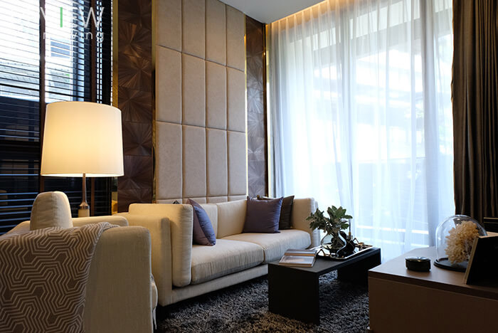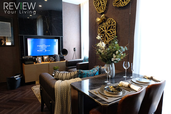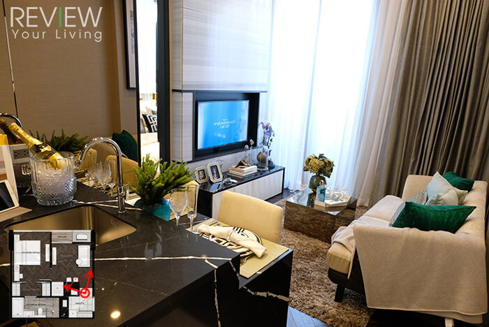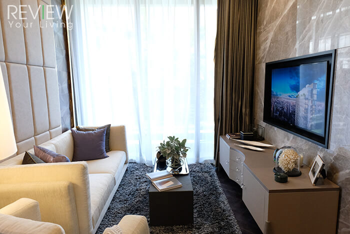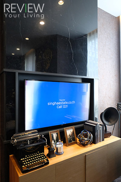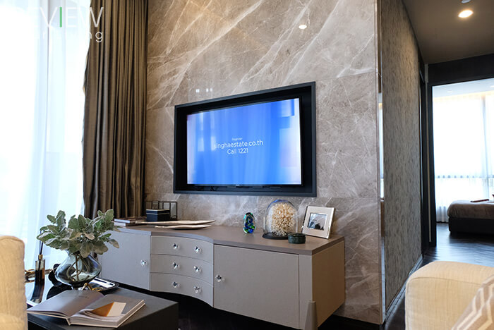 นอกจากการออกแบบที่สวยงามแล้ว ทางโครงการยังตกแต่งผนังด้านหลังคอนโซลทีวัด้วยวัสดุหินอ่อนนำเข้าให้ทุกยูนิตด้วยค่ะ ซึ่งพื้นที่ติดกับมุมนั่งเล่นจะเป็นส่วนของห้องนอนและห้องน้ำนะคะ