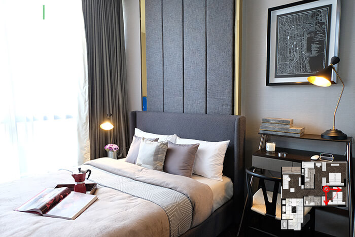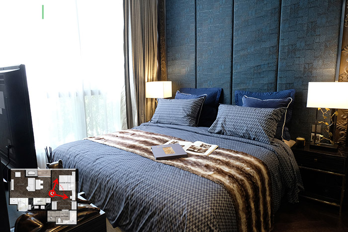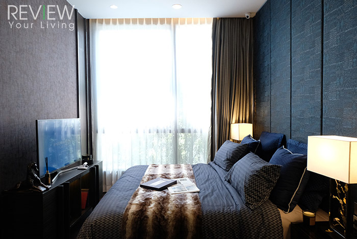 พื้นที่ห้องนอนมีขนาดกว้างกำลังดีเลยนะคะ สามารถจัดวางเตียงขนาด 5-6 ฟุตได้สบาย โดยเหลือพื้นที่เดินได้โดยรอบด้วยค่ะ แถมผนังปลายเตียงยังสามารถโต๊ะคอนโซลทีวีโดยไม่รู้สึกอึดอัดอีกด้วย