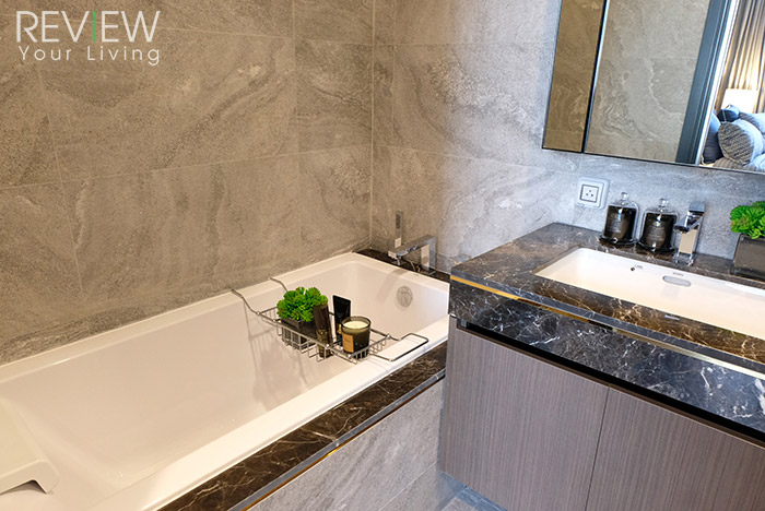 อ่างอาบน้ำจะอยู่ติดกับผนังฝั่งหนึ่งของห้องน้ำนะคะ บริเวณขอบอ่างก็กรุด้วยหินอ่อนสีเข้มนำเข้าเช่นเดียวกับบริเวณล้างหน้า